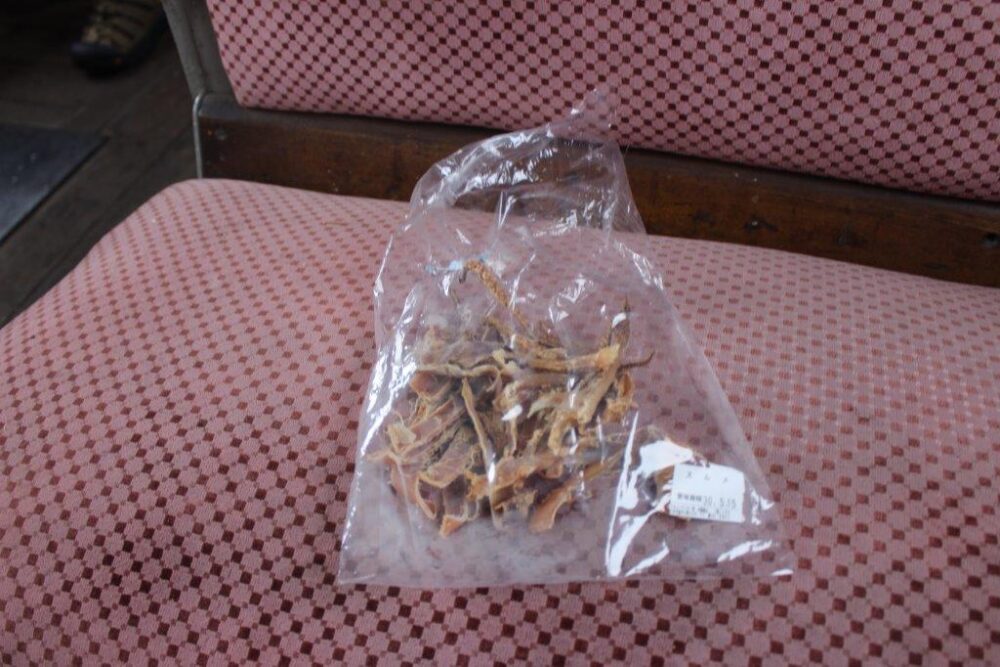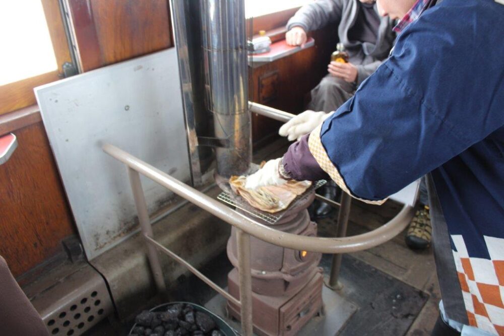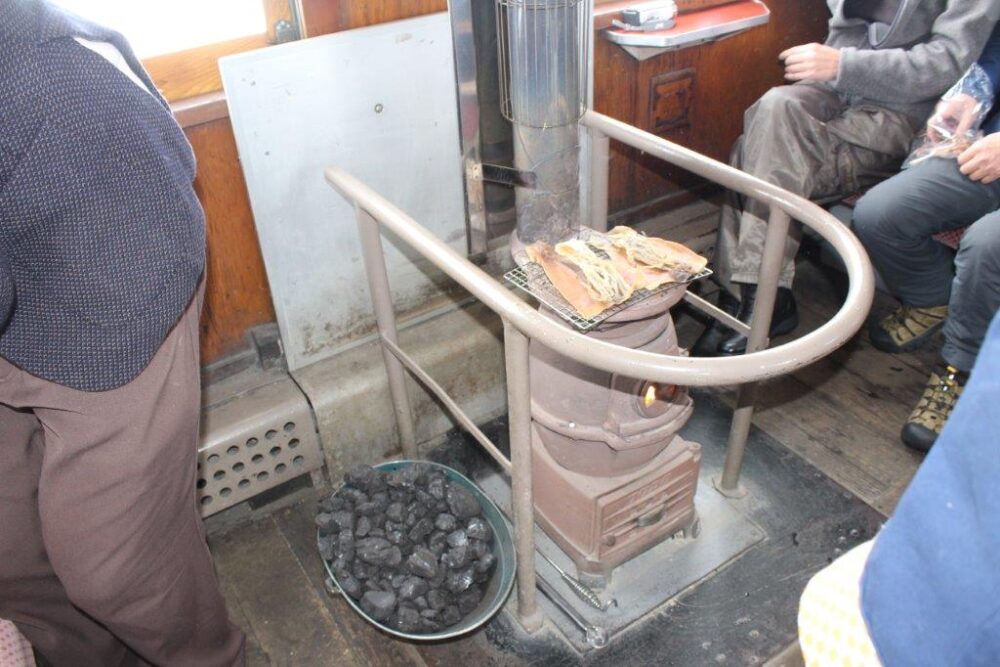何と言ってもストーブで焼く「スルメいか」を食べる事ですね。車内販売で500円(2018年乗車時)です。折角ですから持ち込まず車内で購入をお薦めします。