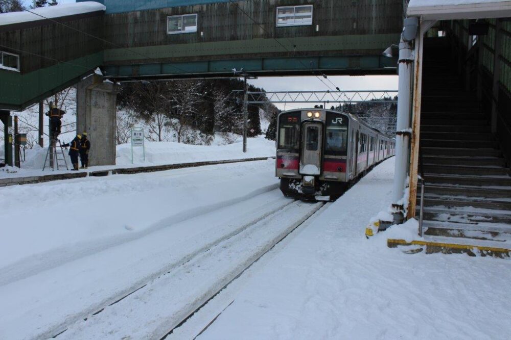 大雪の中、鶴ヶ坂駅へ入線する奥羽本線の普通列車